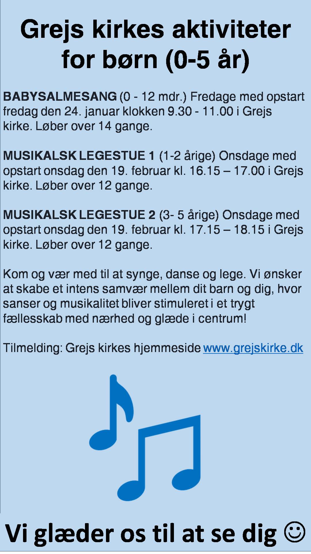 DESCRIPTION:Musikalsk legestue for de 1 - 2 årige Tag din mor eller far med til det store flotte kirkerum! Her vil vi synge sjove børnesange og smukke salmer. Vi vil bl.a. sanse, danse, bruge rekvisitter og høre bibelhistorie! Vi ønsker at udvikle og stimulere dit barns musikalitet, sprog og sanser i et trygt fællesskab, hvor nærhed og glæde er i centrum!