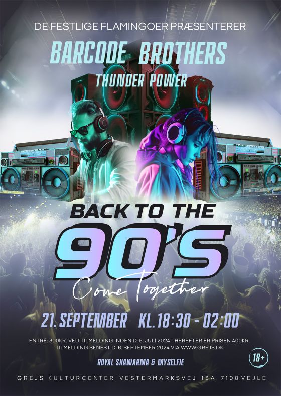 X-ALT-DESC;FMTTYPE=text/html:<p><strong>Flamingoerne</strong> inviterer dig på en rejse tilbage til 90'erne.</p><p>Find dine bedste 90'er-outfits frem fra skabet og forberedt dig på en aften du aldrig før har oplevet i Grejs.</p><p><strong>  Oplev Barcode Brothers LIVE!</strong></p><p>Barcode Brothers er klar til at sætte gang i festen i Grejs med deres berømte numre som "Dooh Dooh", "Flute" og mange flere. Thunderpower vil supplere med alle de hits du kender fra 90'erne.</p><p> </p><p>Vi glæder os til at se dig til en festlig aften med masser af 90'er vibes, lækker mad, dans og nye relationer.</p><p><strong>Mad:</strong> Royal Shawarma serverer de lækreste shawarmas (2 stk. inkl. I entré billetten)</p><p><strong>Billetter:</strong> sælges til kun 300 kr indtil 6. juli, herefter er prisen 400 kr.</p><p> </p><p><img src="images/2024/90er_fest.jpg" alt="" /></p>