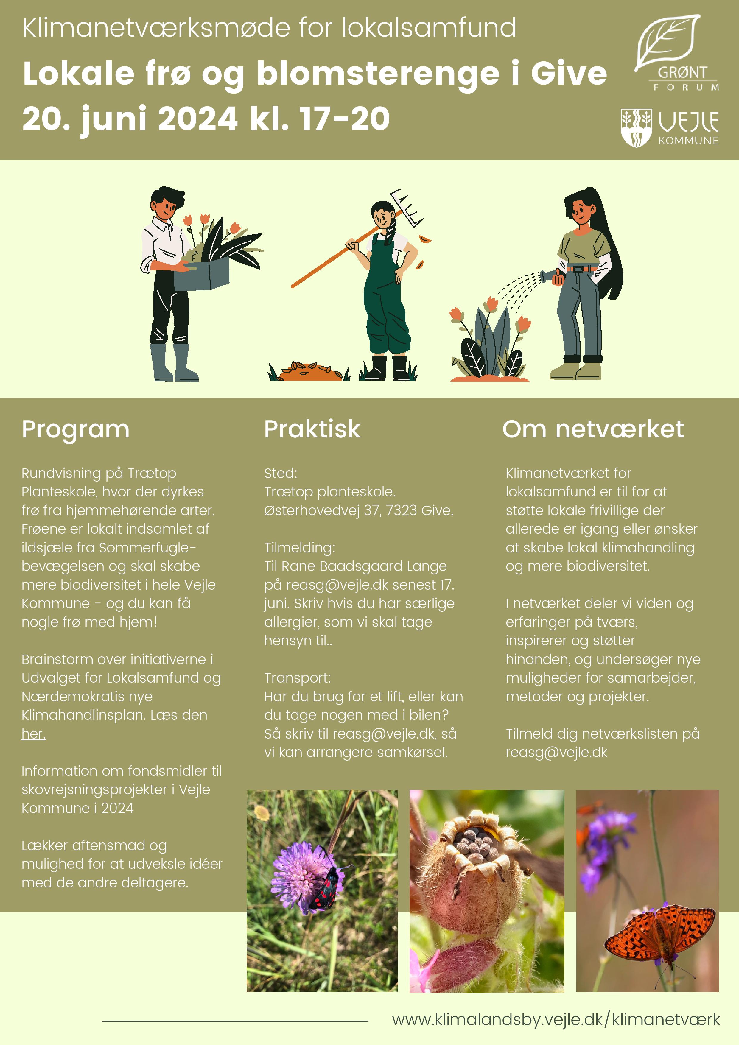 Klimanetværksmøde for Lokalsamfund på Trætop Planteskole i Give. Svend Møller og de frivillige ildsjæle fra Sommerfuglebevægelsen vil vise os deres blomsterfrøprojekt, der skal fremme lokale, hjemmehørende arter og biodiversitet i Vejle.