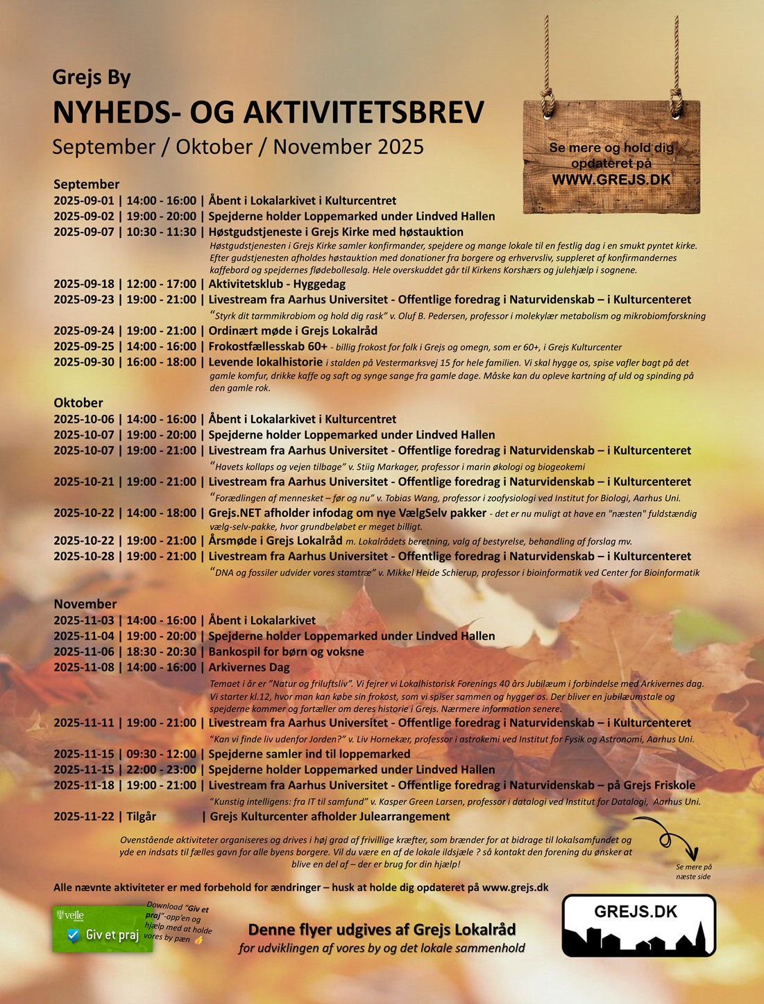 Her kan du nemt og hurtigt tilmelde dig til vores nyhedsmail.Så er du altid opdateret med hvad der sker i Grejs og omegn.
