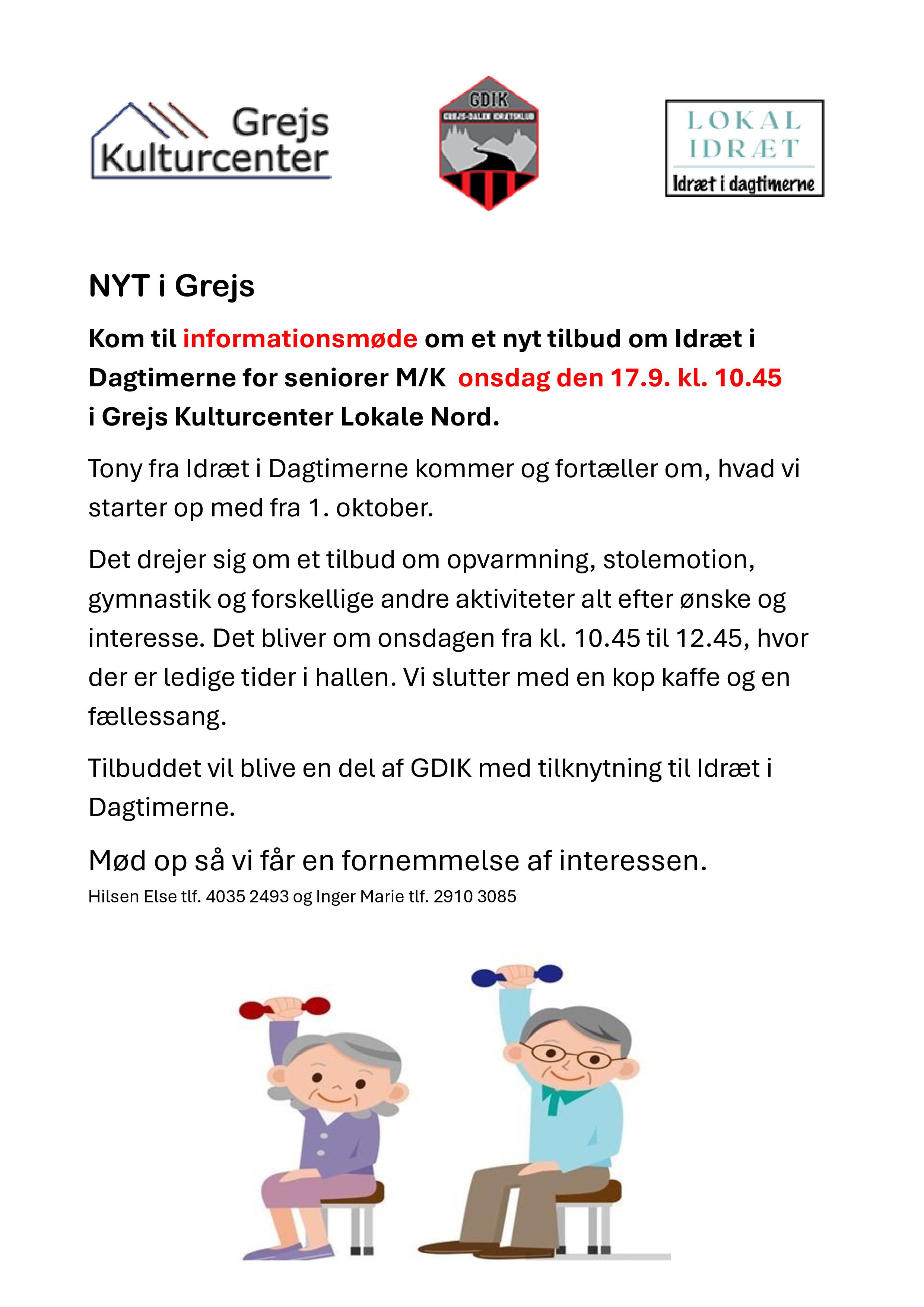 om et nyt tilbud om Idræt i Dagtimerne for seniorer M/K onsdag den 17.9. kl. 10.45 i Grejs Kulturcenter Lokale Nord.