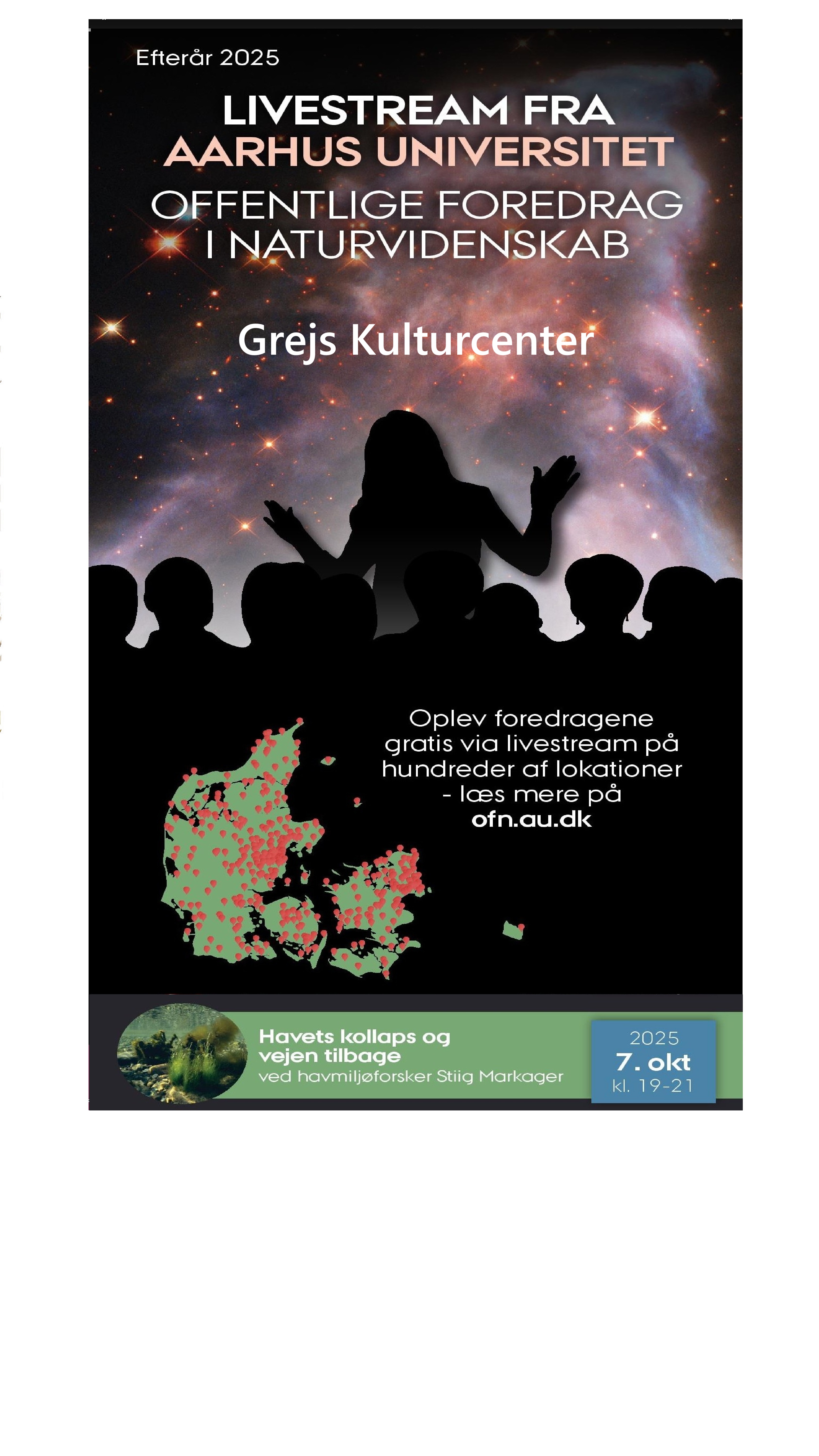 Følg spændende foredrag fra Aarhus universitet i efteråret 2025. En gruppe under Borgerforeningen har indgået aftale med Aarhus Universitet, sådan at vi kan vise foredragene 'live', denne gang på Grejs Kulturcenter Tirsdag den 7. oktober kl. 19 - 21., dvs. mens de vises i et auditorium på universitetet. Man kan vis SMS stille spørgsmål til forskerne undervejs. Der er gratis adgang, og kaffen og kage undervejs er også gratis. I september, oktober og november vil der være 6 foredrag; nærmere annoncering vil følge på Grejs.dk og infotavlen i NETTO.