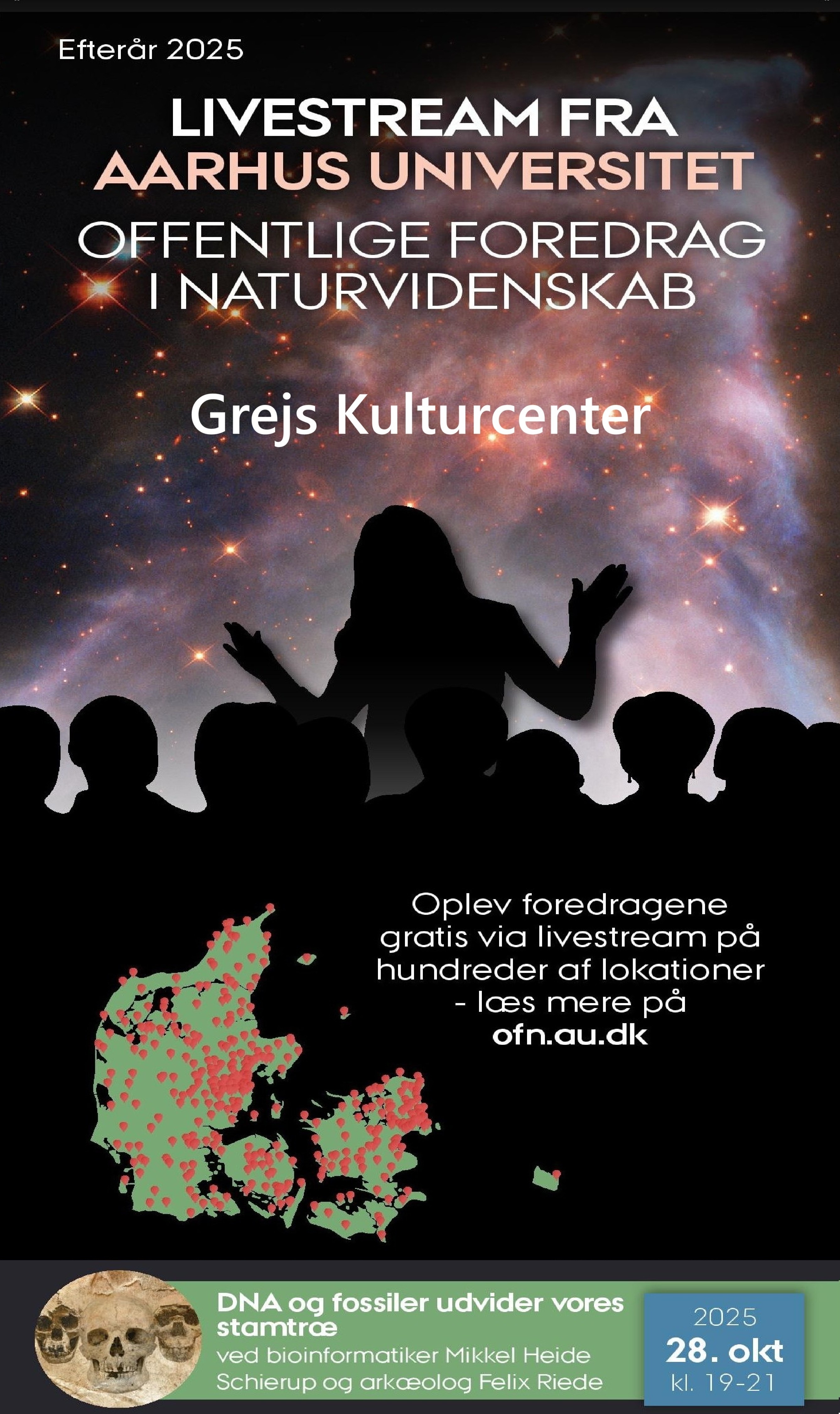 Følg spændende foredrag fra Aarhus universitet i efteråret 2025. En gruppe under Borgerforeningen har indgået aftale med Aarhus Universitet, sådan at vi kan vise foredragene 'live', denne gang på Grejs Kulturcenter Tirsdag den 28. oktober kl. 19 - 21., dvs. mens de vises i et auditorium på universitetet. Man kan vis SMS stille spørgsmål til forskerne undervejs. Der er gratis adgang, og kaffen og kage undervejs er også gratis. I september, oktober og november vil der være 6 foredrag; nærmere annoncering vil følge på Grejs.dk og infotavlen i NETTO.