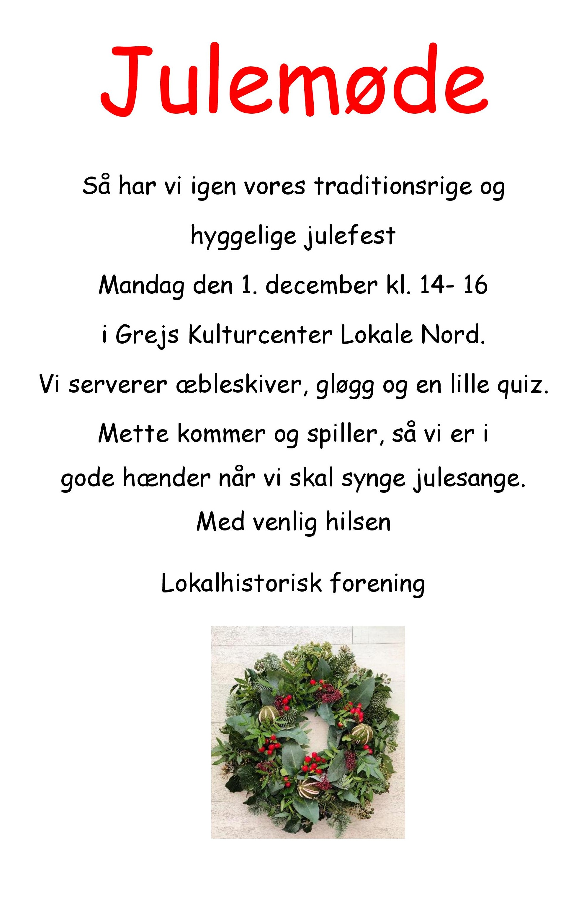 Mandag den 1. december fra kl. 14 - 16. i Grejs Kulturhus Lokale Nord