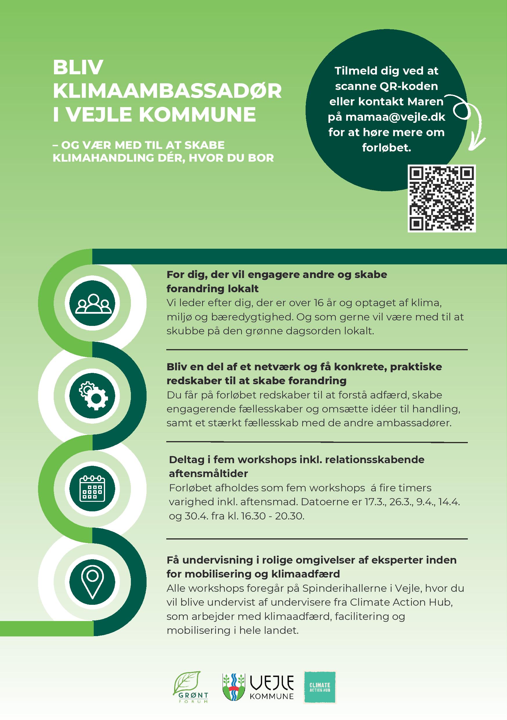 – OG VÆR MED TIL AT SKABE KLIMAHANDLING DÉR, HVOR DU BOR. Vi har lige nu åbent for pladser på næste runde af klimaambassadørforløbet. Hvis det vækker interesse, må I meget gerne dele det i jeres netværk. Her er link direkte til vores hjemmeside: Bliv Klimaambassadør i Vejle Kommune - Grønt Forum