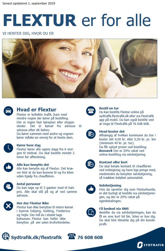 FlexTur er en særlig form for kollektiv trafik uden stoppesteder og køreplan. Du kan benytte flextur i hele Vejle Kommune, dog ikke i bybuszonen Vejle Midtby (se https://www.vejle.dk/borger/mit-liv/trafik-og-parkering/kollektiv-trafik/). Du kan køre alle ugens dage fra kl. 8.00 til 24.00 på nær den 24. og 31. december. Hvad koster det? Du skal betale minimum 40 kr. for en tur. Pris pr. km er 5,50 kr. Flextur er lidt dyrere end bus og tog, men til gengæld bliver du hentet på din bopæl. Når du bestiller turen, får du at vide, hvad den koster. Uden betaling må chaufføren ikke tage dig med. Du kan ikke bruge betalingskort. Du kan læse mere her: https://www.sydtrafik.dk/flextrafik/flextur, hvor du også kan finde denne PDF.
